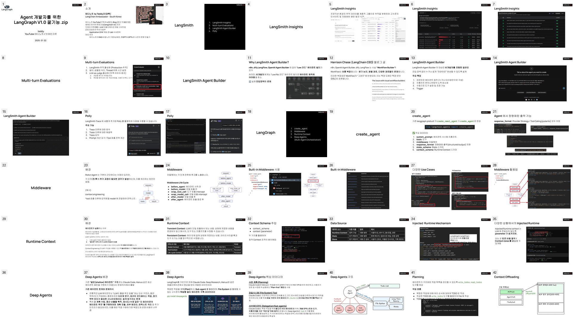 세미나 소개📅 일시 : 2026년 1월 2일 (금) 오후 9시~10시🎯 제목 : LangChain/LangGraph V1 업데이트 이후 신기능 활용하여 에이전트 제작하기!📚 소개 : LangChain과 LangGraph가 V1으로 대대적인 업데이트를 단행하며, 에이전트 개발의 패러다임이 새롭게 정립되고 있습니다. 본 세션에서는 실무에서 바로 활용 가능한 최신 기능들을 심층적으로 살펴봅니다. 먼저, LangSmith의 신기능인 Insights를 통해 에이전트의 성능을 데이터 기반으로 분석하고, Multi-turn Evaluation으로 복잡한 대화형 에이전트의 품질을 체계적으로 평가하는 방법을 다룹니다. 또한 Polly를 활용한 Tracing 디버깅으로 에이전트의 동작을 시각적으로 추적하고 문제를 빠르게 진단하는 실전 기법을 공유합니다. 다음으로, LangGraph V1의 핵심 신기능인 create_agent API를 통해 에이전트를 보다 직관적으로 구축하는 방법과, Built-in/Custom Middleware를 활용하여 인증, 로깅, 에러 처리 등 공통 관심사를 깔끔하게 분리하는 아키텍처 설계 패턴을 소개합니다. 마지막으로, 복잡한 태스크를 처리하는 DeepAgents 설계 전략을 살펴봅니다. Context Offloading으로 메모리를 효율적으로 관리하고, Context Isolation으로 에이전트 간 독립성을 확보하며, Subagent와 Agent Delegation 패턴을 통해 대규모 작업을 여러 에이전트가 협력하여 수행하는 멀티 에이전트 시스템 구축 방법을 실습과 함께 안내합니다.🧑🏫 연사 : 이경록 | 브레인크루 CEO📺 세미나 영상 보기 : https://aifactory.space/task/9253/overview📚 발표자료 미리보기발표자료 다운방법본 태스크의 데이터 탭에서 PDF 파일을 다운로드 받을 수 있습니다.