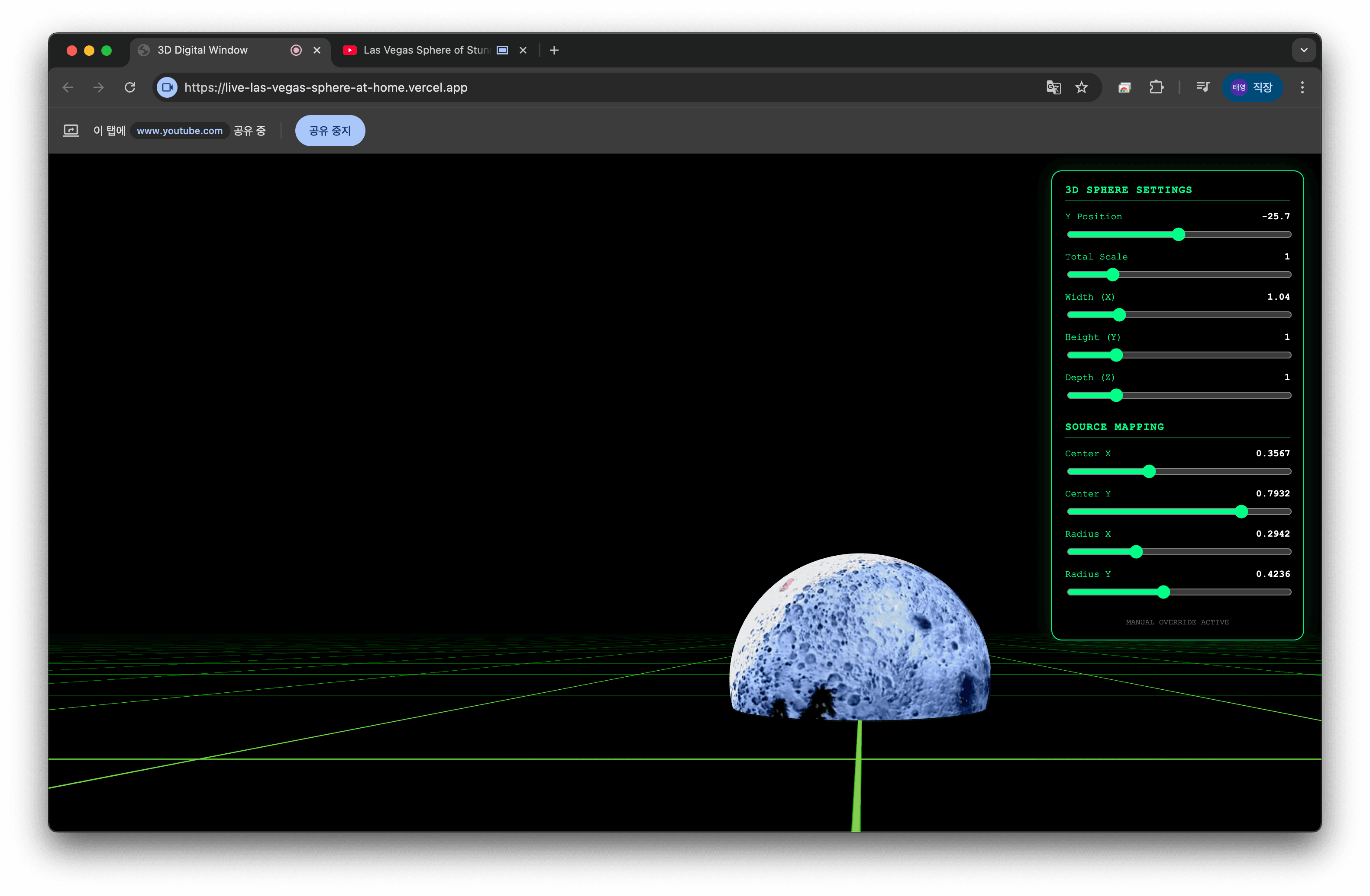 🌐 Bringing the Las Vegas Sphere to Your Desk: An Immersive 3D ExperienceHave you ever looked at the Las Vegas Sphere and wished you could experience its grandeur from the comfort of your own home? While we might not all have a multi-billion dollar budget to build a giant LED dome, we can certainly recreate the magic using modern web technologies.In this post, I’ll walk you through my latest project: Live Las Vegas Sphere at Home. It’s a "digital window" experiment that combines 3D rendering, real-time AI face tracking, and live streaming to create a stunning anamorphic illusion.🎭 The Concept: What is a "Digital Window"?A standard screen shows 3D objects as flat images. However, when we move our heads, the perspective doesn't change, which breaks the illusion of depth.A Digital Window (or Off-Axis Projection) solves this by tracking the user's eye position in real-time. As you move left, right, up, or down, the camera in the 3D scene moves in sync, making it feel like you are looking through your monitor into a physical space where a 3D sphere exists.🛠️ The Tech StackTo bring this to life, I utilized a powerful combination of tools:Three.js: The industry standard for 3D on the web. It handles the rendering of the sphere and the complex camera projections.MediaPipe Face Mesh: Google's AI-powered solution for real-time face tracking. It allows the app to know exactly where your eyes are without needing specialized hardware—just a standard webcam.GLSL Custom Shaders: To map a flat live stream onto a 3D sphere accurately, I wrote custom shaders that handle spherical projection mapping.Vite: For a lightning-fast development environment.🚀 How It Works: Steps to Immersive RealityRecreating the Sphere wasn't just about putting a globe in a scene; it was about the connection.1. The Live FeedUsers can connect a real live stream (like a 24/7 YouTube feed of the Las Vegas Sphere) directly into the app. By using the browser's screen-sharing capabilities, we "pipe" the video texture onto our 3D geometry.2. Precise CalibrationSince every live stream has its own framing, I built a real-time calibration panel. Users can adjust the center points and radius of the mapping to ensure the "Eye" of the sphere looks perfect regardless of the source video's crop.3. The Illusion of DepthOnce the face tracking is active, the scene reacts to your movement. If you lean in, the sphere gets closer. If you peek around the side, you see the curve of the horizon. It transforms your monitor from a flat display into a portal.📸 visual JourneyCheck out the workflow from setup to the final result:Step 1: ConnectStep 2: SourceStep 3: Align🌟 Wrapping UpThis project is more than just a cool visual; it's a peek into the future of immersive computing. By combining AI-driven interaction with high-performance 3D rendering, we can turn everyday devices into magical windows.If you have a webcam and a curious mind, you can try this project on your own desk. It’s an amazing feeling to see the Las Vegas Sphere glowing right in front of you, reacting to your every move.👉 Try the Live Demo HereSource Code : https://github.com/tykimos/live_las_vegas_sphere_at_homeCheck out the repository to get started and build your own digital window!Stay immersive, Taeyoung Kim
