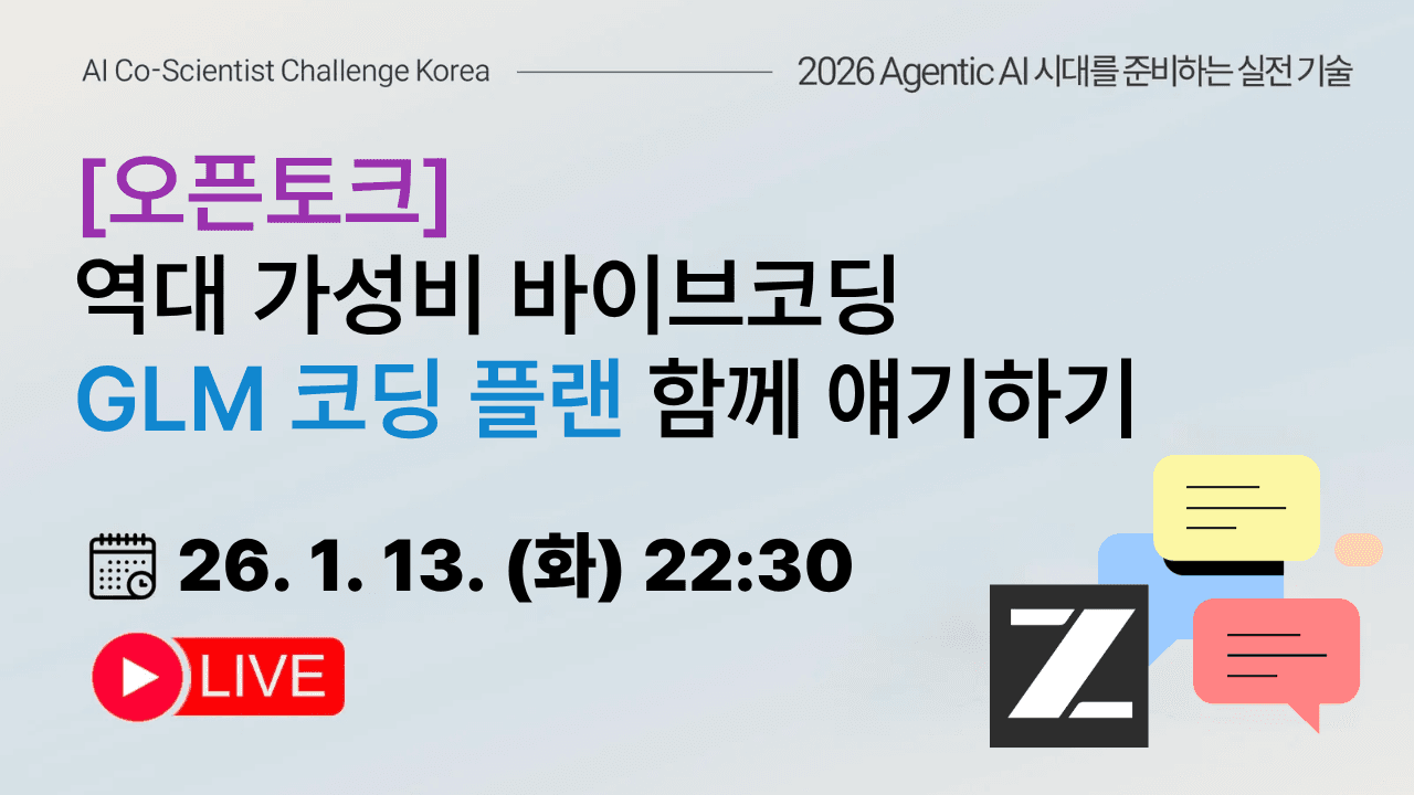 반갑습니다! 인공지능팩토리의 김태영입니다. 2026년의 개발 생태계는 그 어느 때보다 역동적입니다. 특히 화제가 되고 있는 바이브 코딩(Vibe Coding)은 이제 단순한 유행을 넘어, 에이전틱 AI 시대의 핵심적인 코딩 패러다임으로 자리 잡았습니다. 이번 "[오픈토크] 역대 가성비 바이브코딩 GLM 코딩 플랜 함께 얘기하기" 를 주제로 GLM에 대해 온라인 오픈토크 방식으로 가볍게 진행하고자 자리를 마련하였습니다. 💡 바이브 코딩(Vibe Coding)은 무엇인가요바이브 코딩은 개발자가 구현하고자 하는 소프트웨어의 의도(Vibe)와 결과물의 느낌을 자연어로 전달하고, 상세 구현은 AI 에이전트가 도맡는 방식을 의미합니다. 비개발자에게는 코딩 장벽을 허물어 아이디어를 즉시 앱으로 만드는 마법이 됩니다. 또 개발자에게는 단순 버그 수정에서 벗어나, 시스템 설계와 고도화된 아키텍처에 집중할 수 있는 자유를 줍니다. 🚀 왜 GLM 코딩 플랜이 ‘역대급 가성비’일까요최근 공개된 GLM-4.7 시리즈와 그에 따른 GLM Coding Plan은 2026년 현재 가장 주목받는 선택지입니다.1. Claude급 성능, 1/7의 가격Claude 3.5/4 시리즈와 대등한 수준의 논리력과 UI 구현 능력을 보여주면서도, 비용은 약 7분의 1 수준으로 책정되었습니다. 개인 개발자나 스타트업이 에이전틱 AI를 무제한에 가깝게 실험해볼 수 있는 환경입니다.2. 에이전트 최적화 기능 (Thinking Mode)GLM-4.7은 실행 전 스스로 계획을 세우는 ‘Thinking Block’을 유지합니다. 이는 에이전트가 복잡한 태스크를 수행할 때 환각을 줄이고 검증 과정을 스스로 수행하게 만드는 요소입니다.3. IDE와의 호환성Cline, Roo Code, Kilo Code 등 최신 에이전트 프레임워크와 연동됩니다. 🗣️ 오픈토크에서 우리가 나눌 이야기는이번 오픈토크는 일방적인 강연이 아닌 GLM 사용 방식에 대해 함께 공유하고 소통하는 방식이니, 부담 없이 많은 관심과 적극적인 참여를 부탁드립니다! 📅 오픈토크 신청방법본 오픈토크는 “2026 AI Co-Scientist Challenge Korea (AI 연구동료 경진대회) - 대상수상팀 최대 500만원 상금 지급” 연계 오픈토크로, 대회 참여자를 대상으로 진행됩니다.상단 태스크 제목을 클릭합니다. (아래 이미지에서 노란색 영역) 그 후 태스크 페이지에 있는 [참여하기] 버튼을 통해 신청해 주세요.혹은 https://aifactory.space/task/9235/overview 링크에서 [참여하기] 버튼을 클릭하세요.참여입력폼의 10번째 항목에 “오픈토크 신청 목적”이라고 기입합니다.오픈토크 시작 전에 본 대회 공지사항 게시물로 링크가 제공됩니다.그럼 온라인 오픈토크에서 뵙겠습니다. 김태영 드림