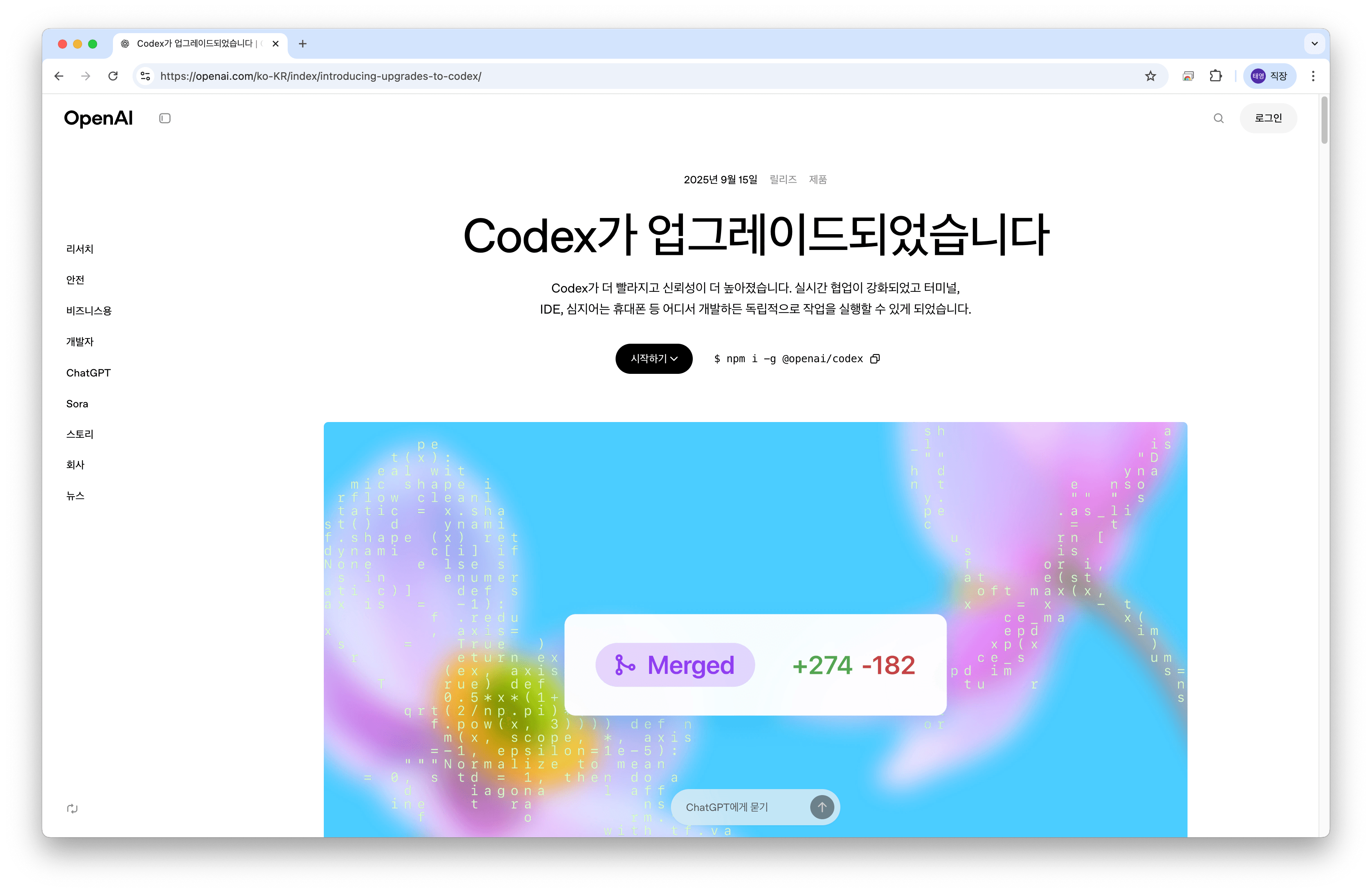 안녕하세요, 김태영입니다. 저는 평소 바이브코딩(VibeCoding)을 할 때 주로 Claude 코드를 많이 사용해왔습니다. 그런데 최근 OpenAI에서 새로운 버전의 Codex가 공개되었다는 소식을 듣고 직접 설치해봤어요. 이번 포스팅에서는 “업그레이드된 Codex를 설치하고 실행하는 전 과정”을 정리해보겠습니다.1️⃣ Codex란 무엇인가?Codex는 OpenAI가 개발한 AI 기반 코드 어시스턴트입니다. 즉, 자연어로 지시하면 그에 맞는 코드를 자동으로 생성해주거나, 기존 코드를 분석·수정해주는 도구예요. 이번에 업데이트된 버전(2025년 9월 15일자)은 ChatGPT 계정과 통합 로그인 지원, CLI(Command Line Interface) 환경 개선, IDE(예: VSCode, Cursor 등) 확장 기능 강화가 주요 변화점입니다. 공식 페이지는 다음 링크에서 확인할 수 있습니다. 👉 https://openai.com/ko-KR/codex/2️⃣ 설치 준비 (Mac 기준)터미널을 열고 아래 화면 처럼 두 명령어를 실행하면 됩니다. (맥기준)3️⃣ 새 프로젝트 폴더 만들기 및 실행Codex를 사용할 빈 프로젝트 폴더를 하나 만들어줍니다:<code class="language-plaintext">mkdir ~/Projects/first_codex cd ~/Projects/first_codex codex .</code>codex . 명령은 현재 폴더를 Codex 프로젝트로 초기화하며, 이후부터 Codex가 이 폴더 내에서 코드를 생성하거나 관리할 수 있게 됩니다.4️⃣ 로그인 과정 (ChatGPT 계정 연동)터미널에서 처음 Codex를 실행하면 아래와 같은 메시지가 나타납니다.<code class="language-plaintext">1. Sign in with ChatGPT 2. Use OpenAI API Key</code>ChatGPT 유료 사용자(Pro, Team, Enterprise 등)라면 1번 로그인 옵션을 선택하면 됩니다. API Key를 직접 관리 중인 경우에는 2번을 선택해 Key를 입력해도 됩니다.저는 ChatGPT 계정을 사용하고 있기 때문에 1번을 선택했습니다. 그럼 자동으로 브라우저가 열리고 로그인 화면이 나타납니다.로그인을 성공적으로 했다면 아래와 같은 화면이 나옵니다.터미널에서도 성공했다고 나옵니다.5️⃣ 첫 실행 — Codex 명령창 사용하기이제 터미널에 AI가 명령을 기다리는 프롬프트가 표시됩니다. 여기서 원하는 명령을 입력해보세요. 예를 들어:<code class="language-plaintext">Write a Python script that sorts a list of numbers.</code>라고 입력하면, Codex가 바로 파이썬 코드를 작성해줍니다. 또는 기존 코드를 붙여넣고 “이 코드 오류를 수정해줘”라고 요청할 수도 있습니다.6️⃣ IDE에서 Codex 사용하기 (Cursor 확장)Codex는 CLI 외에도 IDE 확장 패키지를 제공합니다. 저는 평소 Cursor IDE를 자주 사용하기 때문에, Cursor 전용 Codex 확장을 설치했습니다. 공식 Codex 페이지에서 “Download for Cursor”를 클릭합니다.그럼 아래와 같이 확장 프로그램을 보실 수가 있습니다. 여기서 “설치” 버튼을 클릭합니다.경고창이 아래와 같이 띄워지면 “게시자 신뢰 및 설치” 버튼을 클릭합니다.그럼 왼쪽 사이드바에서 “Codex”를 선택할 수 있습니다. 7️⃣ Codex 확장 기능 설정IDE 하단의 설정 영역을 보면 다음과 같은 옵션을 선택할 수 있습니다.권한 수준 설정: Codex가 코드에 접근하거나 자동 수정할 수 있는 범위를 지정합니다.모델 선택: gpt-5-codex, gpt-5 등 원하는 모델을 선택할 수 있습니다.8️⃣ 마무리 — Codex와 함께 바이브코딩 시작하기이제 CLI와 IDE 양쪽 모두에서 Codex를 사용할 준비가 완료되었습니다. 그럼 Codex로도 바이브코딩 함께 하시죠~
