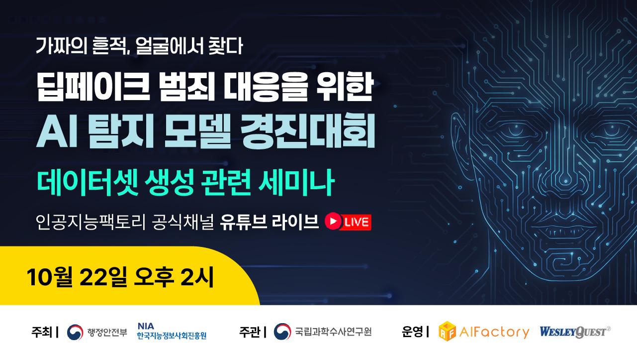 안녕하세요. 여러분🙋♂️ 10월 27일 (월) 오후 4시에 ‘딥페이크 범죄 대응을 위한 AI 탐지 모델 경진대회’ 연계 세미나가 진행됩니다. XR 및 AI 영상 제작 전문가로 활동중이신 imk 김민호 대표 프로듀서님이 강연 연사로 참여하여, ‘AI 영상’ 과 관련된 전문적인 강연을 진행해주실 예정입니다 💁 세미나 안내날짜: 2025. 10. 27.(월)시간: 오후 4시 ~ 5시 장소: 인공지능팩토리 공식 유튜브 채널 라이브참가비 무료 🧑🏫 세미나 내용AI 영상 “숏폼 생성” 편AI 영상 이제는 ‘풀다비 딥페이크 레벨’ 이다.AI 가상 인물 생성 캐스팅Sora2 - AI 영상은 앞으로 어디까지 갈 것인가.🧑🏫 참가 대상 AI 딥페이크 탐지에 관심 있는 분들AI 콘텐츠 제작에 관심 있는 분들 AI 이미지 및 영상 생성에 관심 있는 분들 🧑🚀 연사 소개 | imK 김민호 대표 프로듀서 현) imK Studio의 대표 프로듀서이자 테크니컬 디렉터XR 및 AI 영상 제작 전문가로 다양한 프로젝트 참여 한국콘텐츠진흥원, 과학기술정보통신부, LGU+, Autodesk, 이화여대, 포항공대 등 여러 기업 및 기관의 컨설팅, 자문 및 평가, 집필활동과 교육프로그램 개발 등 다양한 산업적 교육적 프로젝트 참여🔥 경진대회 참여하기 이번 세미나는 경진대회 참여 독려를 위해 기획된 세미나로 딥페이크와 AI 영상 관련된 내용을 담고 있습니다. 세미나에 참여하신 뒤 ‘딥페이크 범죄 대응을 위한 AI 탐지모델 경진대회’도 잊지 말고 꼭 참여해주세요🥰 경진대회는 이미지·동영상 속 얼굴에 한정한 딥페이크 판별 모델을 선발, 비공개 테스트셋 자동 채점을 통해 공정성과 신뢰성을 확보하고, 집단지성에 기반한 경쟁으로 우수 모델을 선정을 목표로 진행됩니다. 다시한번 많은 관심과 참여 부탁드리겠습니다 🙋♂️ 경진대회 참여하기 링크