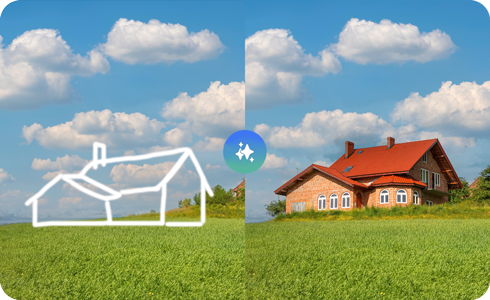 이 이미지는 AI 이미지 복원 또는 생성 기술을 설명하는 예시로 보입니다. 왼쪽에는 단순한 스케치 또는 윤곽선만으로 표시된 집이 있고, 오른쪽에는 그 윤곽선을 기반으로 생성된 실제 집 사진이 보입니다. 배경은 푸른 하늘과 초록색 잔디밭이 있으며, 생성된 집은 벽돌 구조와 빨간 지붕을 가진 전형적인 시골 집의 모습을 하고 있습니다.