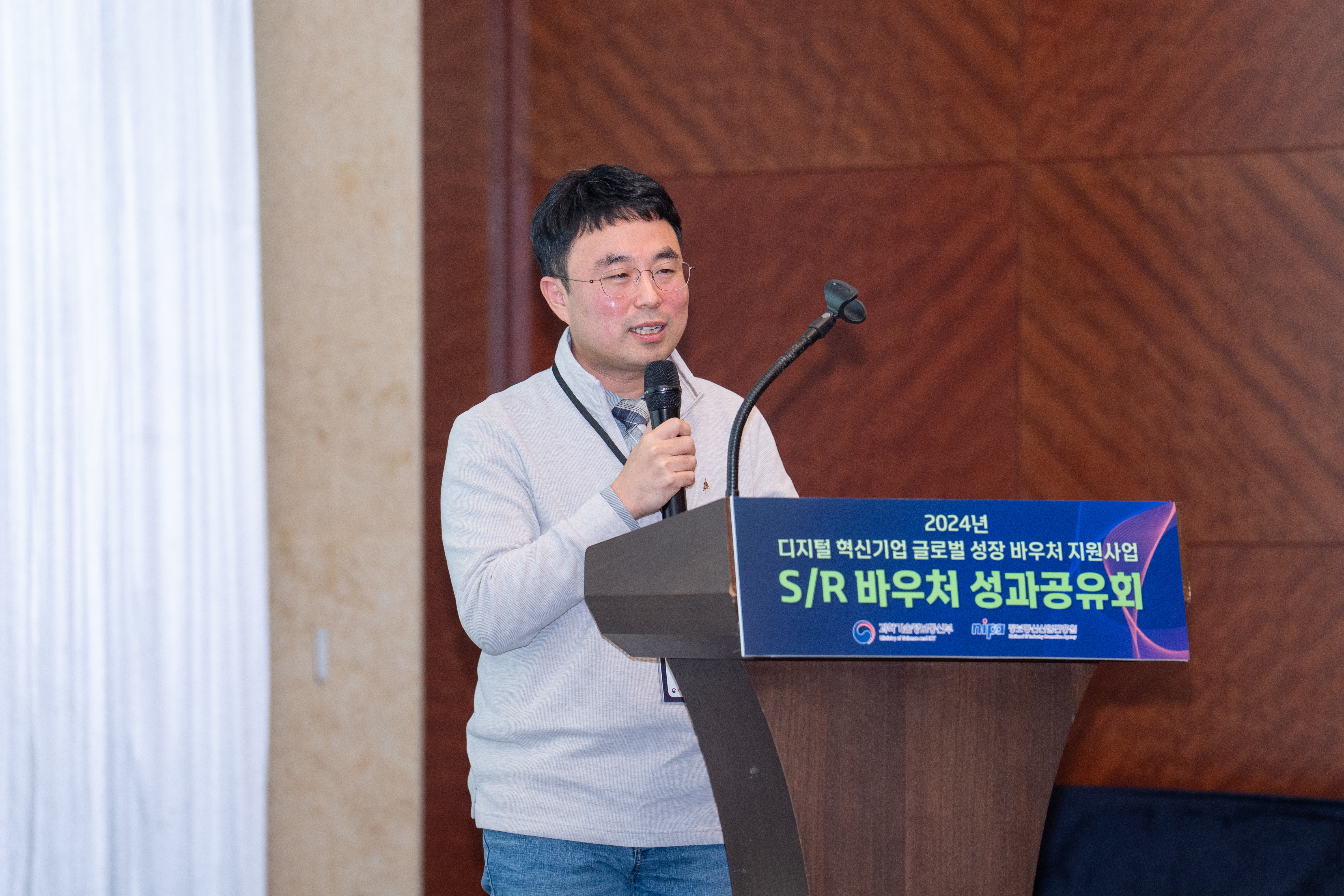 (대전정보문화산업진흥원이 주관한 ‘2024 디지털 혁신기업 글로벌 성장 R바우처 지원사업’에서 (주)인공지능팩토리가 우수기업으로 선정되었으며, 김태영 대표가 발표 중인 모습입니다.)