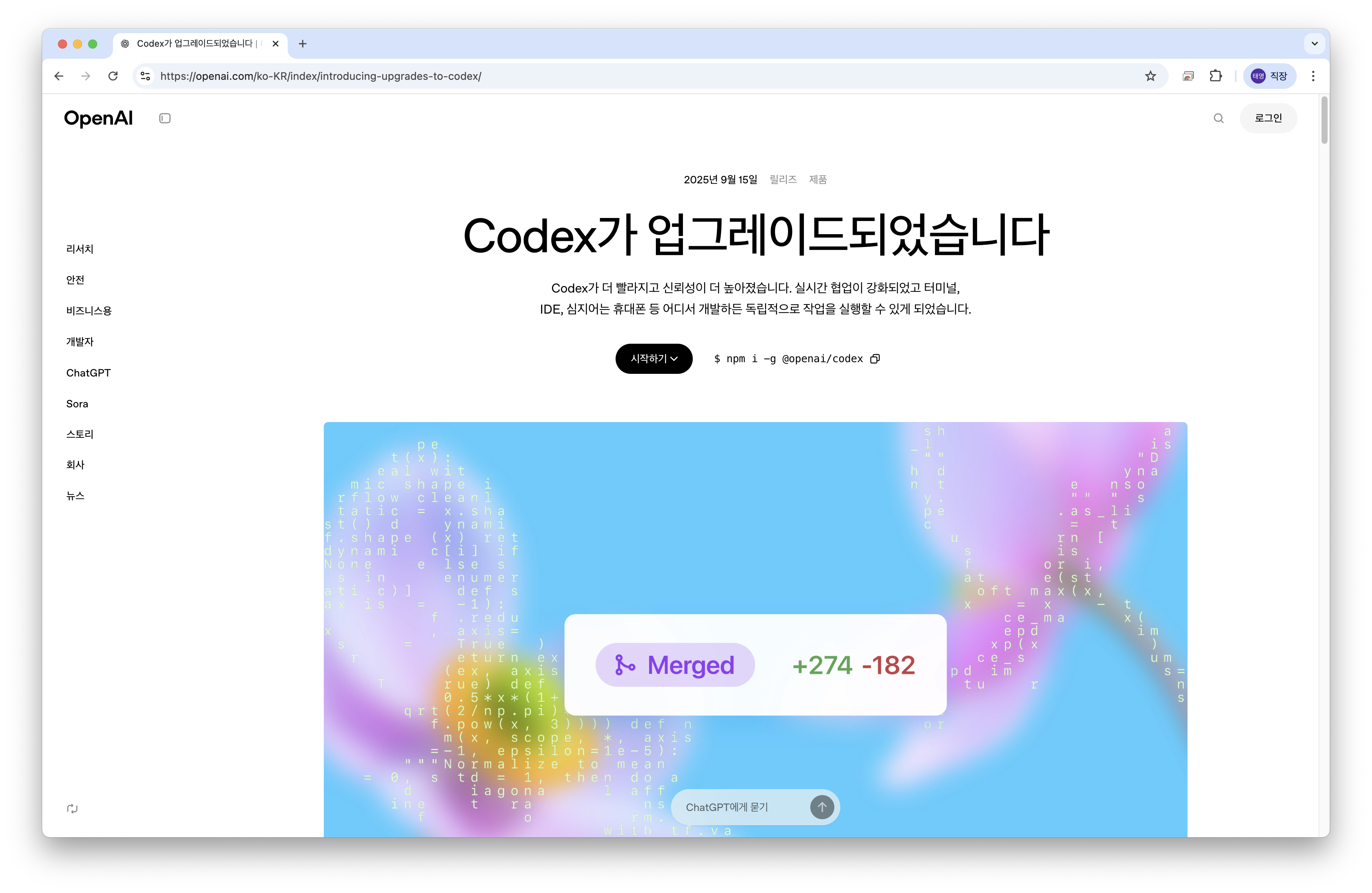 Codex는 OpenAI가 개발한 AI 기반 코드 어시스턴트입니다. 즉, 자연어로 지시하면 그에 맞는 코드를 자동으로 생성해주거나, 기존 코드를 분석·수정해주는 도구예요. 이번에 업데이트된 버전(2025년 9월 15일자)은 ChatGPT 계정과 통합 로그인 지원, CLI(Command Line Interface) 환경 개선, IDE(예: VSCode, Cursor 등) 확장 기능 강화가 주요 변화점입니다. 공식 페이지는 다음 링크에서 확인할 수 있습니다. 👉 https://openai.com/ko-KR/codex/