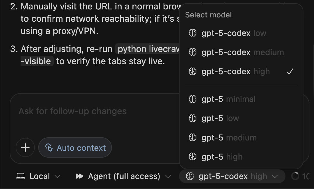 gpt-5-codex,gpt-5등 원하는 모델을 선택할 수 있습니다.