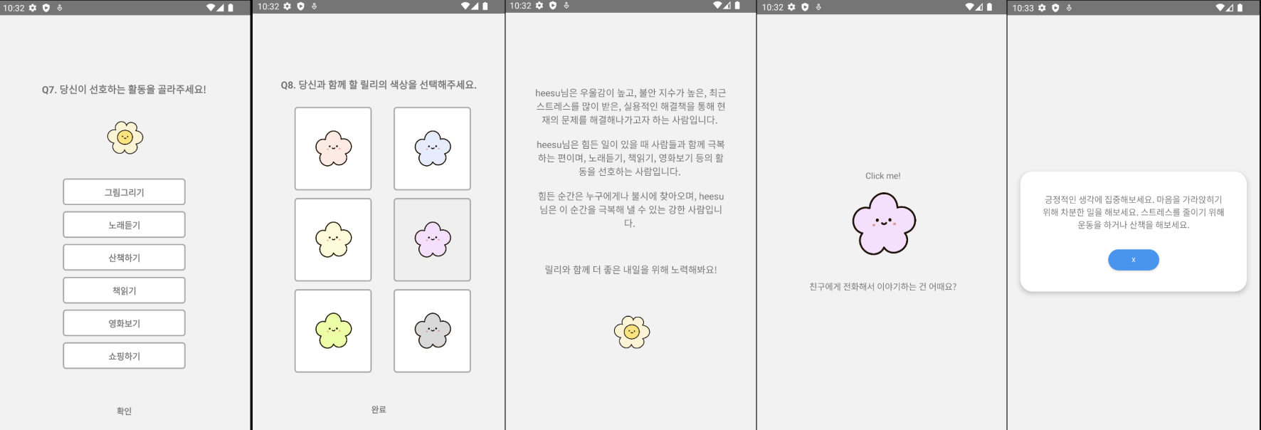 - 릴리는 핸드폰 애플리케이션의 형태로 24시간 서비스를 지원합니다. 건강한 감정을 가진 사용자들에게 매일 적절한 격려와 미션을 제공해주면서 릴리를 사용하는 시간동안 본인의 감정을 돌볼 수 있도록 합니다. 매일 짧은 일기를 작성하면 거기에 대한 코멘트를 릴리가 남겨주는 기능 및 커뮤니티 생성 등의 확장 방향성을 생각하고 있습니다.