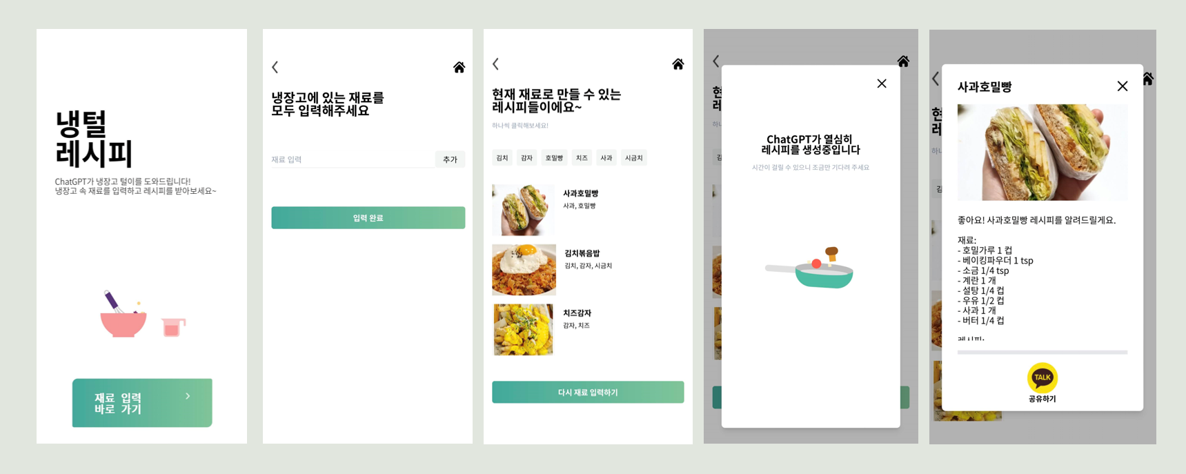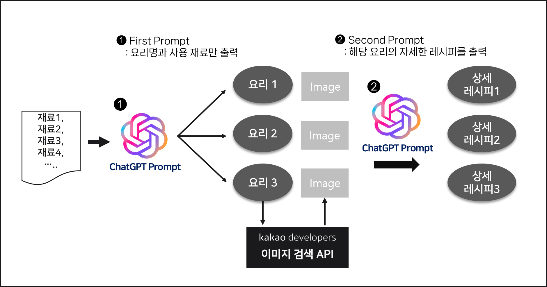최근 비대면 시대 분위기에 따라 집에서 요리를 하는 사람들이 늘어나면서 레시피에 대한 고민이 늘어나고 있다, 특히, 냉장고에 있는 재료들이 한정돼 있거나, 유통기한이 가까운 재료들을 처리해야 할 때는 고민이 더욱 가중된다. 이를 해결하기 위해 ChatGPT API를 사용한 레시피 생성 서비스를 기획하였다.