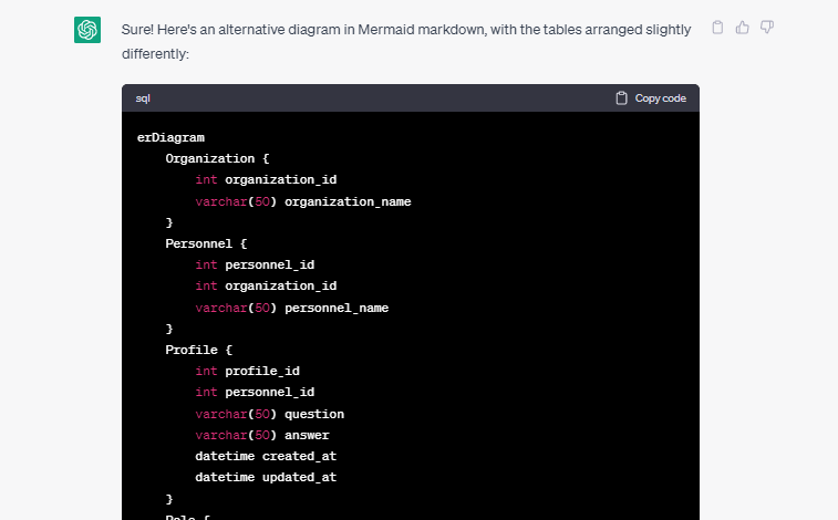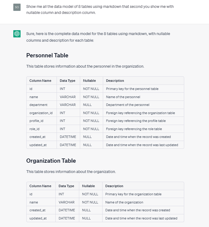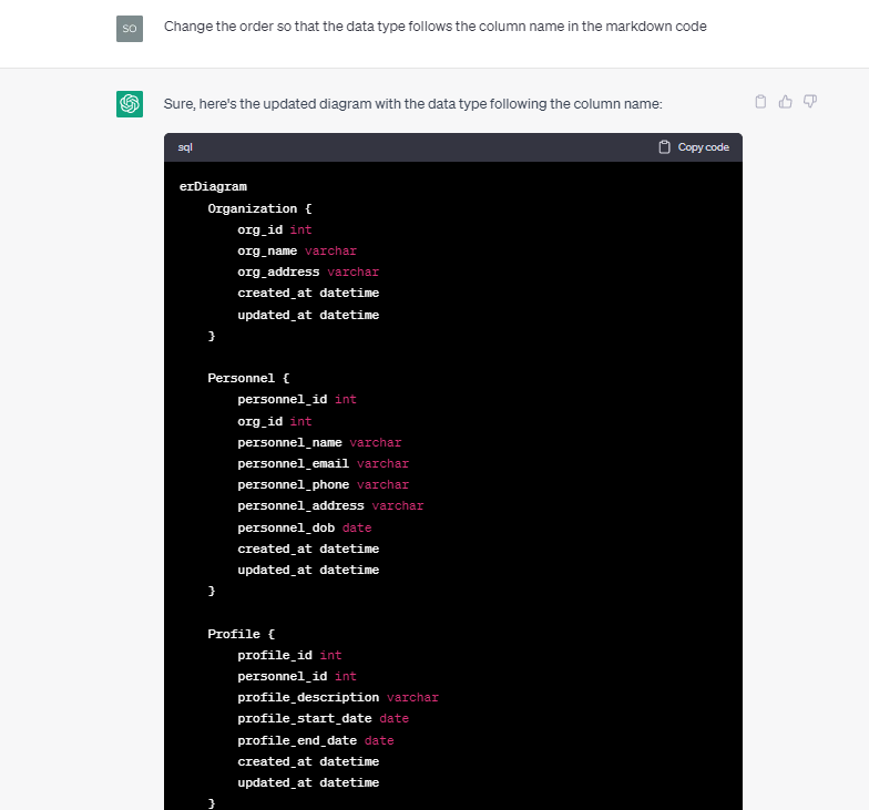 2) 1차적인 markdown code는 data type과 컬럼명을 반대로 노출하는 경우가 있어 이 부분은 확인 후 조정하면 됨 (아래 2차코드 참고)