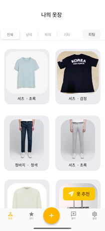 나의 옷장 페이지에서는 유저가 등록한 옷의 정보를 한눈에 확인할 수 있다. 페이지 상단에 위치한 바를 통해 상의, 하의, 기타로 등록된 옷을 각각의 카테고리로 구분해 볼 수 있다. 페이지 우측 하단의 옷 추천 버튼을 통해 소지하고 있는 옷을 바탕으로 코디를 추천해주는 옷 추천 페이지로 이동할 수 있다.