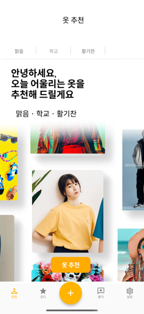 추천 정보는 각 옷의 썸네일 사진과 종류, 색을 포함한 추천 옷 조합으로 표시되며, 해당 코디의 추천 정보도 함께 텍스트로 출력된다. 유저는 옆으로 스와이프하여 다른 추천 정보를 확인할 수 있다. 추천 정보를 통해 유저는 새로운 코디 아이디어를 얻을 수 있고, 자신의 옷장에서 등록된 옷을 더욱 효과적으로 활용할 수 있다.