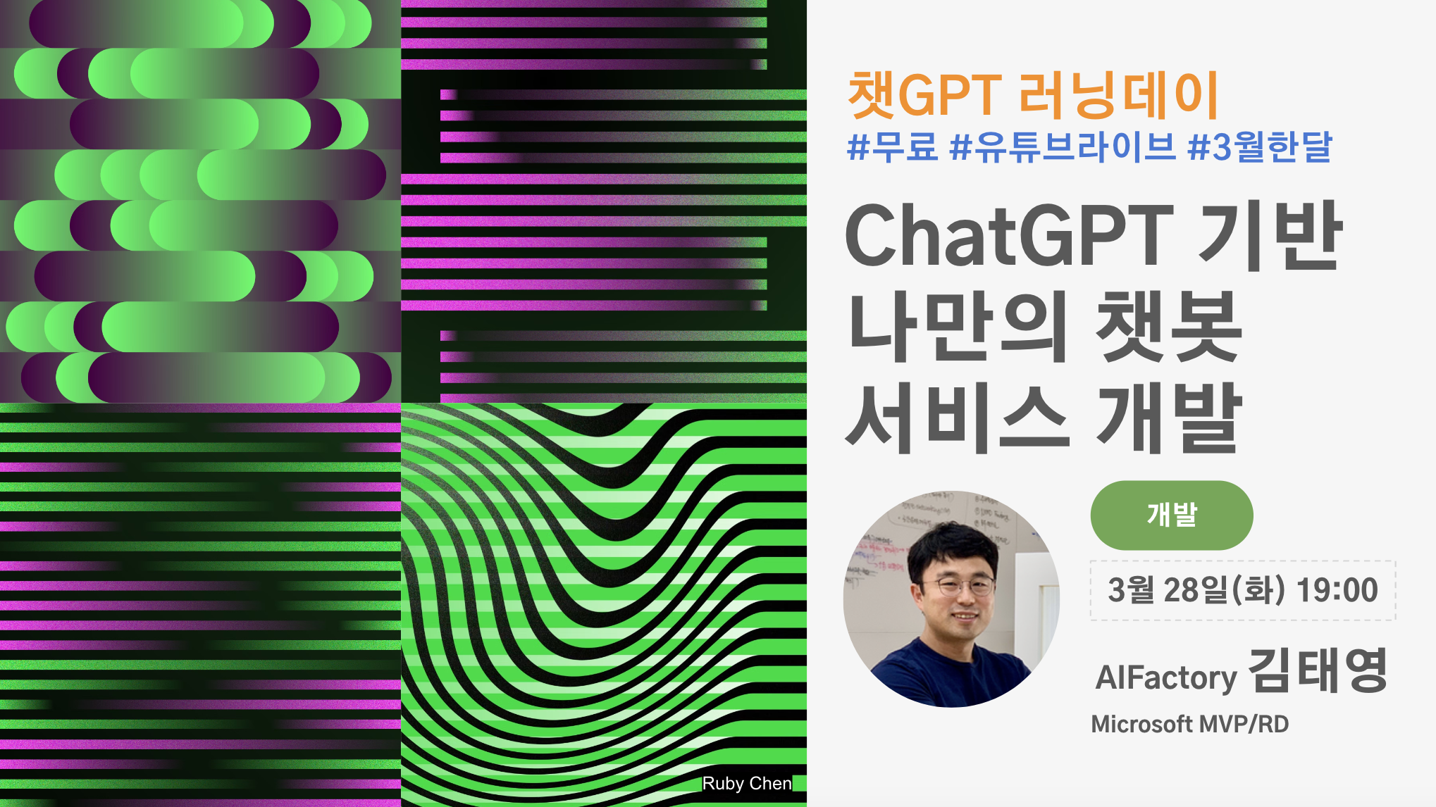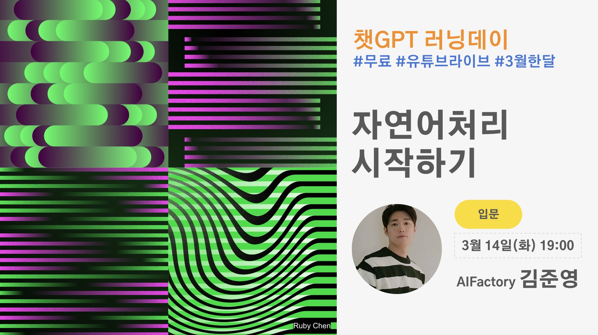 - 챗GPT 러닝데이 안내 (3월달 매주 화요일 저녁 7시~9시 온라인) >> https://aifactory.space/learning/2291/discussion/191