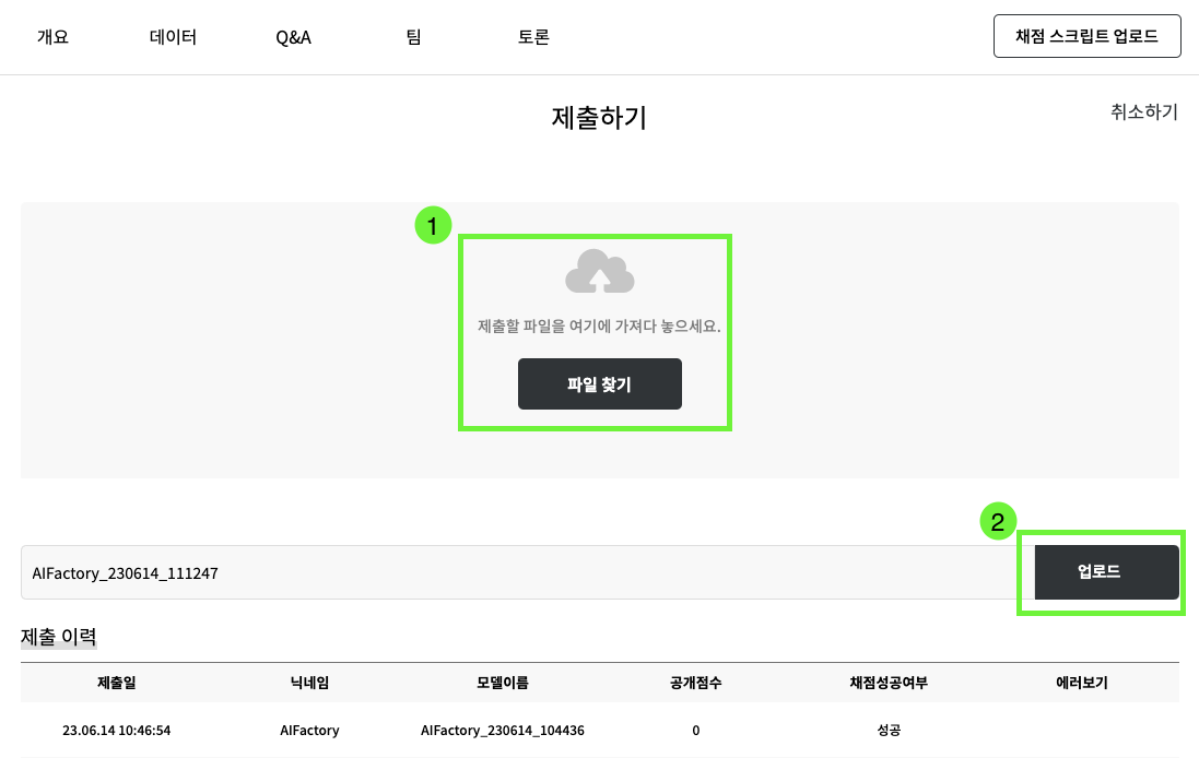 *'제출 이력' 부분의 점수 및 채점 항목은 본 대회와 관련없는 항목으로, 제출파일이 ‘제출이력’에 업로드 되었다면 무사히 제출된 것입니다 :)