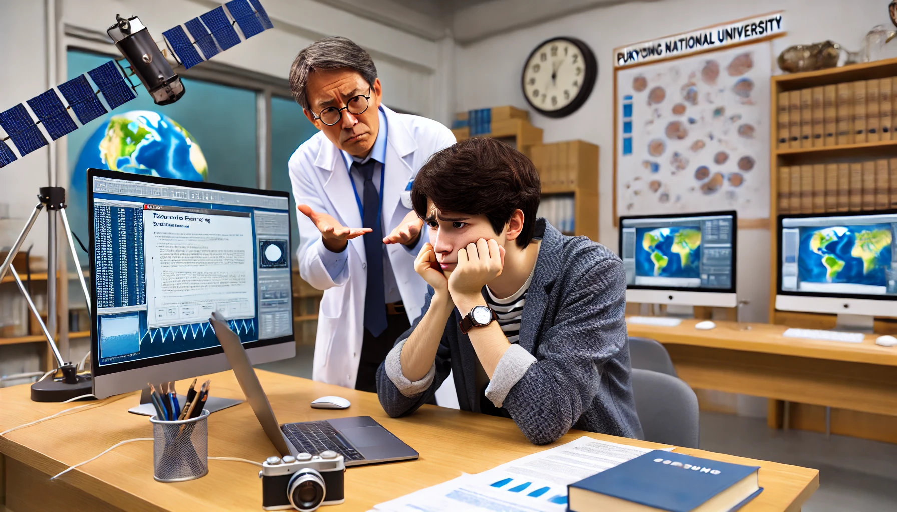 A 20-year-old male student in the Remote Sensing Lab at Pukyong National University is working on a presentation for a conference. He is using a MacBook and a Samsung monitor. The student looks anxious and depressed as he works on the PPT. His professor, who looks displeased, is standing beside him, giving critical feedback. The lab setting includes scientific equipment, books, and maps related to Earth and environmental science.