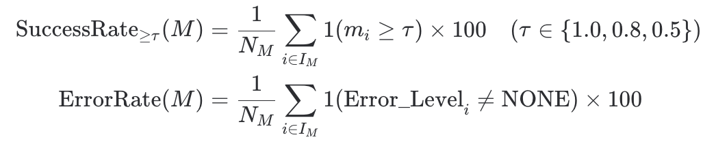 - 성공률: 특정 임계값( τ τ ) 이상을 기록한 케이스의 비율입니다. (예: τ = 1.0 τ=1.0 은 완벽한 정답률)