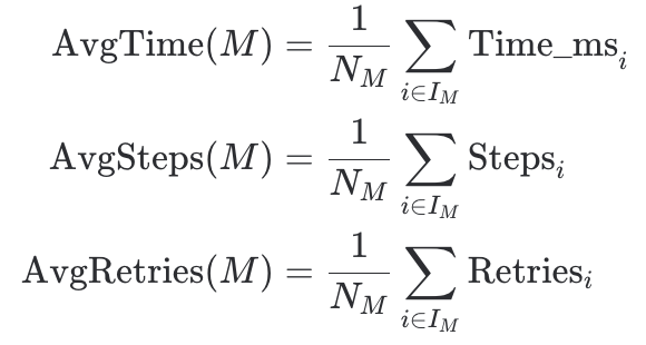 평균 소요 시간(ms), 추론 단계 수(Steps), 재시도 횟수(Retries)를 측정합니다.